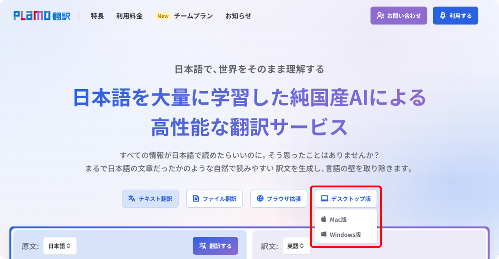 デスクトップアプリは、すべてのプラン(Freeプランを含む)でご利用いただけます。 PLaMo翻訳トップページのダウンロードボタンからインストーラがダウンロードできます。ぜひお試しください。