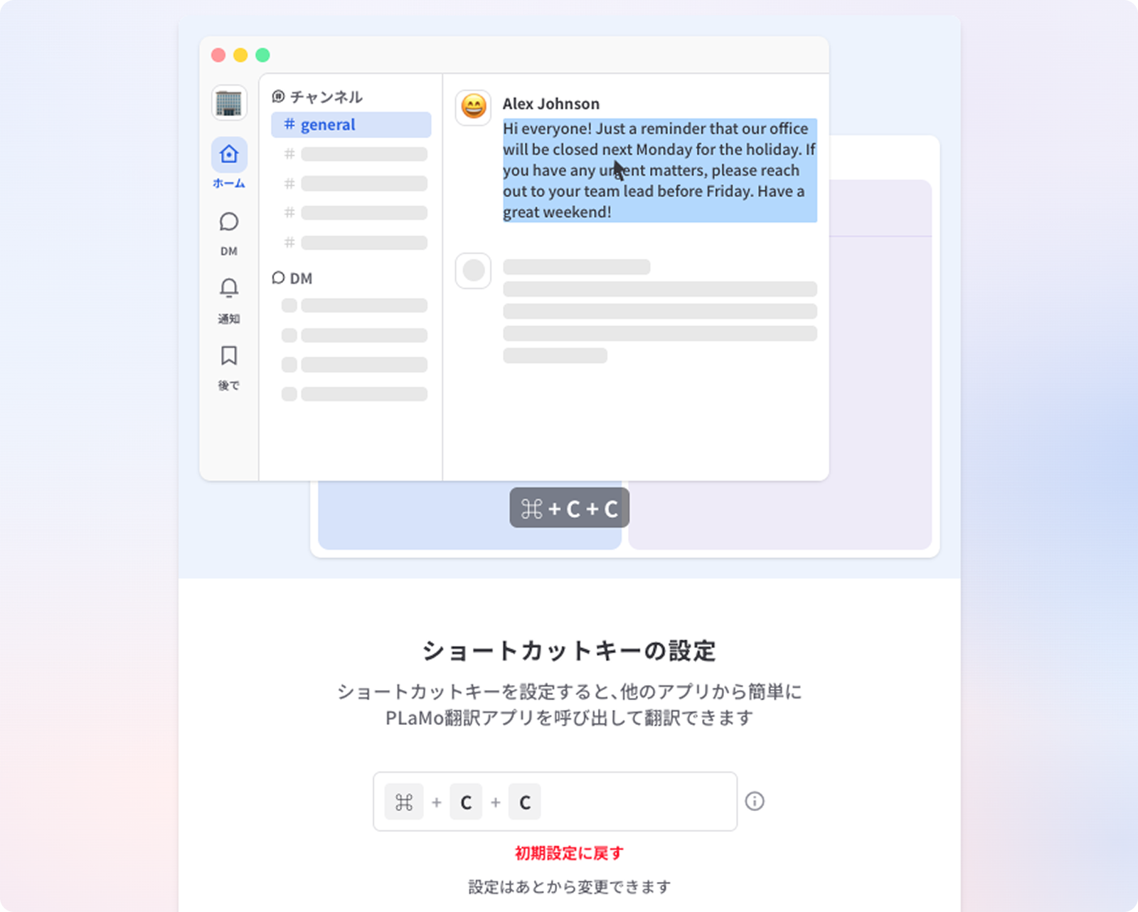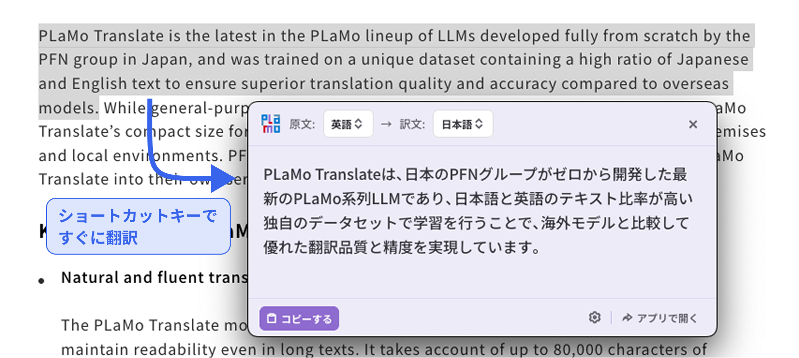 他のアプリケーション上でテキストを選択し、以下のショートカットキーを押すだけで、PLaMo翻訳のウィンドウがポップアップし、すぐに翻訳結果を確認できます(ショートカットキーは変更可能です)。